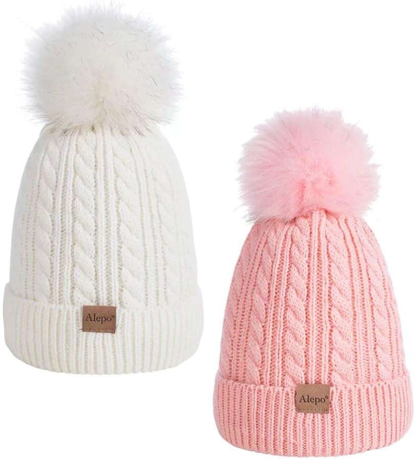 KIDS WINTER BEANIE HAT, CHILDREN'S WARM FLEECE LINED KNIT THICK SKI CAP WITH POM POM FOR BOYS GIRLS - PINK&WHITE
