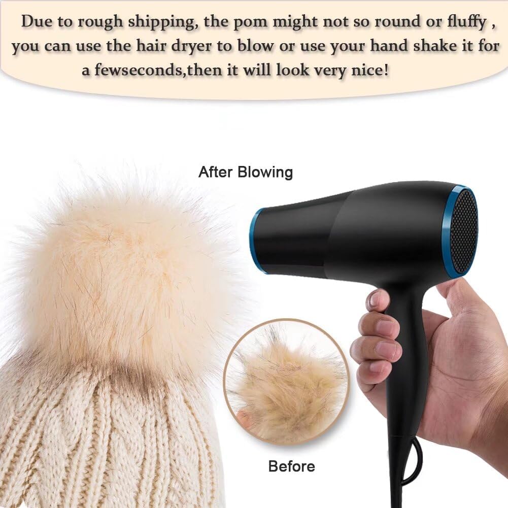 Attention: After receiving the hat, use hair dryer with cold wind and brush with small-tooth comb to make the fur fluffy. Then, shake the faux fur pom pom to let the float hair gone, handwash only for hat to prevent deformation.